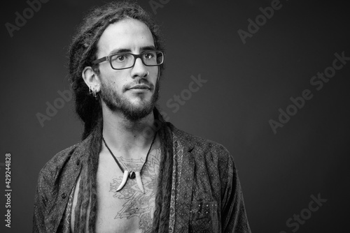 Fototapeta premium Young handsome Hispanic man with dreadlocks in black and white