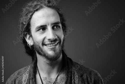 Fototapeta premium Young handsome Hispanic man with dreadlocks in black and white