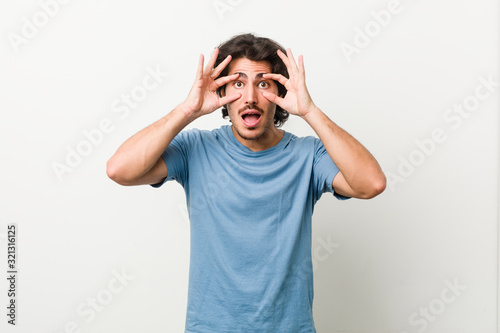 Fototapeta premium Young handsome man against a white background keeping eyes opened to find a...