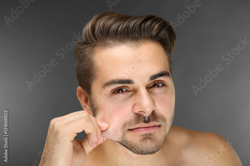 Obraz premium Young handsome man examining his face on grey background