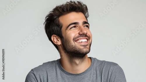 © Johannes, Fototapeta premium Young handsome man over isolated background looking away to side with smile on face, natural expression. Laughing confident. transparent background