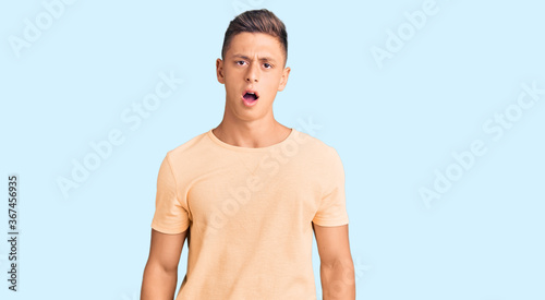 Fototapeta premium Young handsome man wearing casual clothes in shock face, looking skeptical and sarcastic, surprised with open mouth
