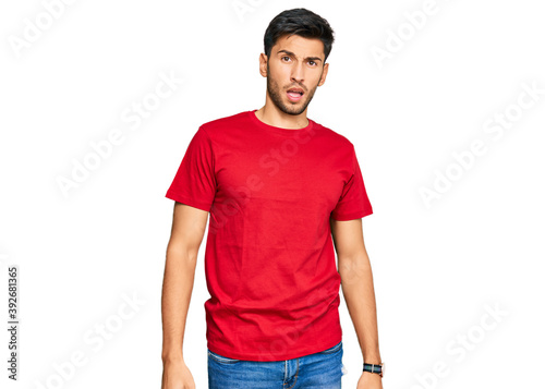 Fototapeta premium Young handsome man wearing casual red tshirt in shock face, looking skeptical...