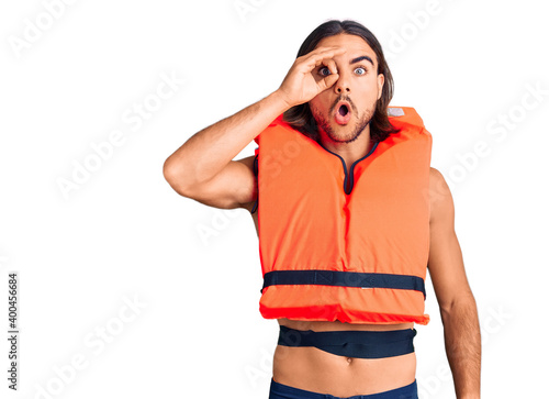 Fototapeta premium Young handsome man wearing nautical lifejacket doing ok gesture shocked with...