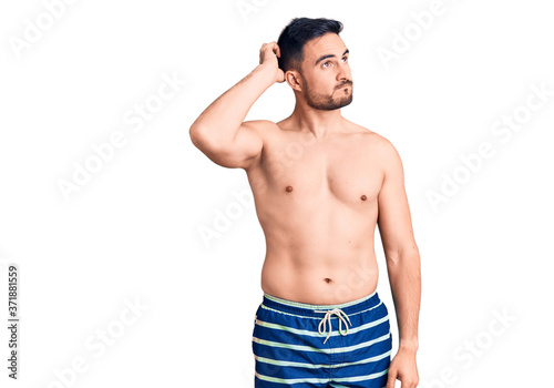 © Krakenimages.com, Fototapeta premium Young handsome man wearing swimwear confuse and wondering about question. uncertain with doubt, thinking with hand on head. pensive concept.