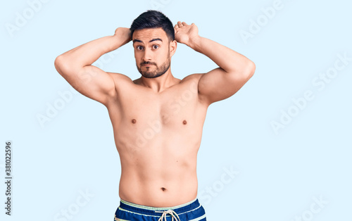 © Krakenimages.com, Fototapeta premium Young handsome man wearing swimwear doing bunny ears gesture with hands palms looking cynical and skeptical. easter rabbit concept.