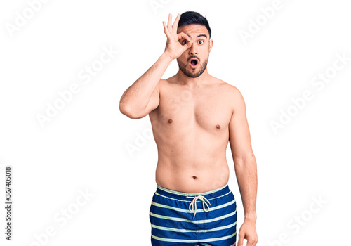 © Krakenimages.com, Fototapeta premium Young handsome man wearing swimwear doing ok gesture shocked with surprised face, eye looking through fingers. unbelieving expression.
