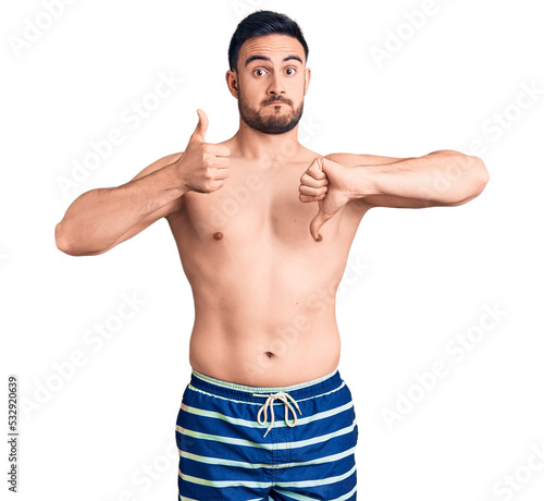 © Krakenimages.com, Fototapeta premium Young handsome man wearing swimwear doing thumbs up and down, disagreement and agreement expression. crazy conflict