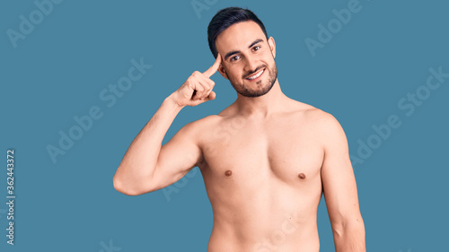 © Krakenimages.com, Fototapeta premium Young handsome man wearing swimwear smiling pointing to head with one finger, great idea or thought, good memory