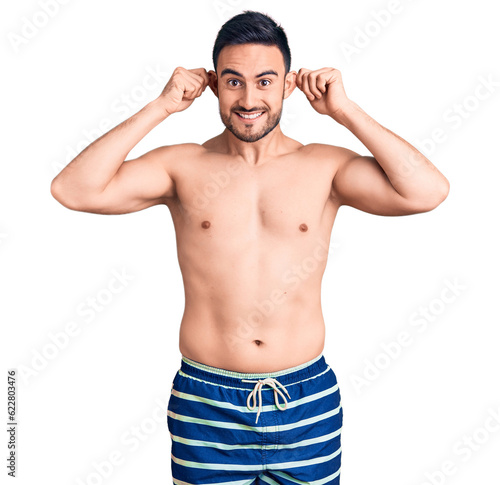 © Krakenimages.com, Fototapeta premium Young handsome man wearing swimwear smiling pulling ears with fingers, funny gesture. audition problem