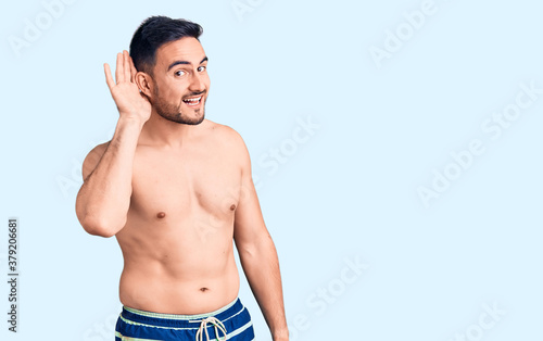 © Krakenimages.com, Fototapeta premium Young handsome man wearing swimwear smiling with hand over ear listening an hearing to rumor or gossip. deafness concept.