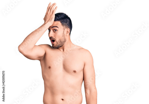 © Krakenimages.com, Fototapeta premium Young handsome man wearing swimwear surprised with hand on head for mistake, remember error. forgot, bad memory concept.