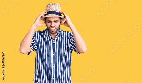 Fototapeta premium Young handsome man with beard wearing summer hat and striped shirt with hand on head for pain in head because stress. suffering migraine.