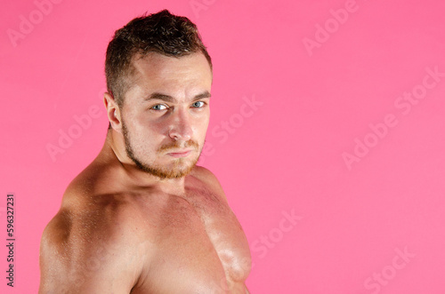 © vladorlov, Fototapeta premium Young handsome trainer posing in the studio. A man with a beautiful athletic body.