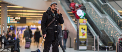 © Space_Cat, Fototapeta premium Young handsome traveler walking in modern airport terminal, using smartphone app in public wifi area, messaging, travelling with luggage bag, wearing casual style clothes