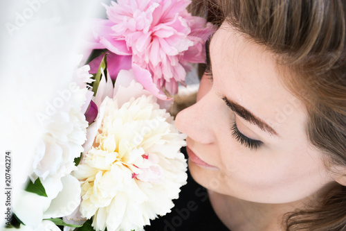 © Кристина Тримайлова, Fototapeta premium Young Happy Bride With Flower Bouquet