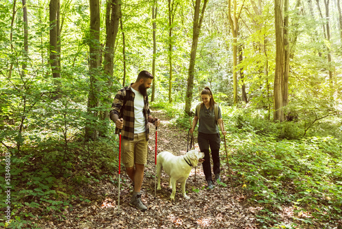 Obraz premium Young happy couple and their dog at hiking through the woods enjoying the...