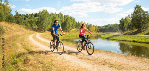 © Maryia Bahutskaya, Naklejka premium Young Happy Couple Riding Bicycles by the River. Healthy Lifestyle Concept.