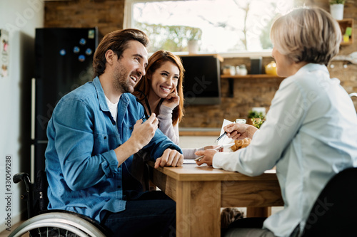 © Drazen, Obraz premium Young happy couple talking to insurance agent while using touchpad on a meeting.