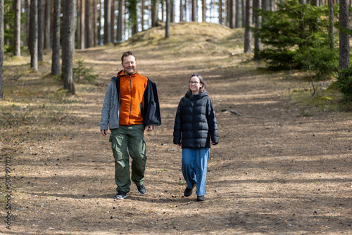 © Enigma, Fototapeta premium Young happy family father and daughter during a walk in the spring park. Portrait dad with child together. Family holiday in garden or forest