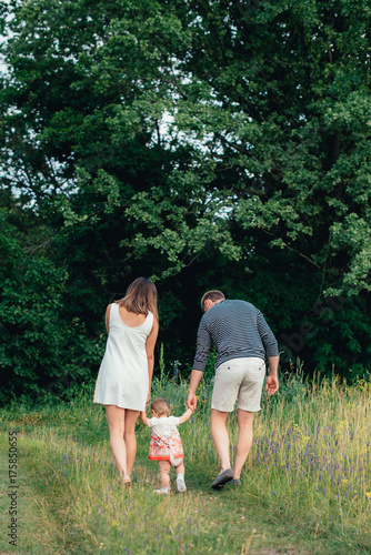 Obraz premium young happy family with little beautiful baby with blue eyes walking in summer park at sunset.