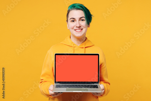 Naklejka premium Young happy IT woman with dyed green hair wear hoody casual clothes hold use work on blank screen workspace area laptop pc computer isolated on plain yellow orange background studio Lifestyle concept
