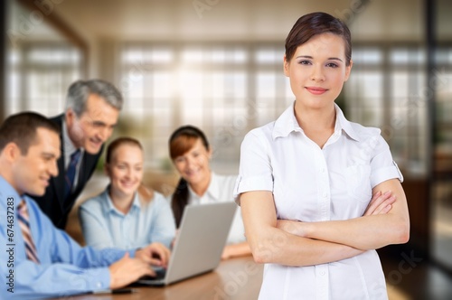 © BillionPhotos.com, Fototapeta premium Young happy manager worker in the office, AI generated image