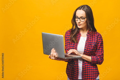 Naklejka premium Young happy smiling woman in casual clothes holding laptop and sending email to her best friend. Isolated against yellow background.