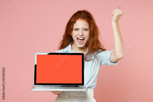 Naklejka premium Young happy student businesswoman redhead freelancer woman 20s in blue shirt hold laptop pc computer with blank screen workspace area do winner gesture clench fist isolated on pastel pink background.