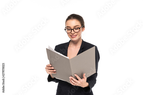 Fototapeta premium young happy successful businesswoman in black suit and glasses reading documents in folder isolated on white