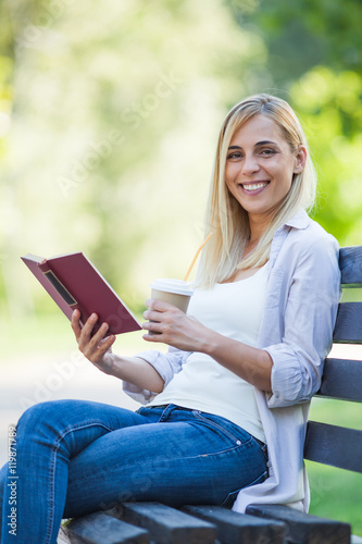 Fototapeta premium Young happy woman is sitting in park. She is reading book and drinking coffee to go.