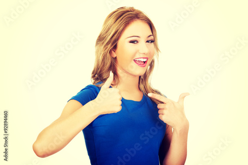 Fototapeta premium Young happy woman with thumbs up.