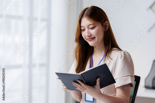 Fototapeta premium Young happy woman work on laptop, asian female reading financial document report or learning online education and business concept.