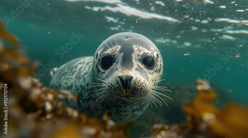 Fototapeta premium Young harbor seal swimming underwater in blue ocean water