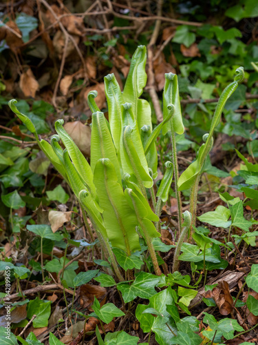 © Mushy, Obraz premium Young Hart's tongue fern unfurling in nature. Asplenium scolopendrium.
