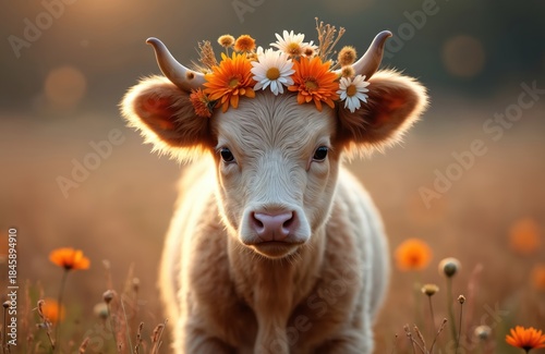 © miss irine, Obraz premium Young highland cow calf wears wreath of orange and white flowers in autumn meadow. Small bovine mammal stands peacefully in warm sunset light. Cute farm animal enjoys nature.