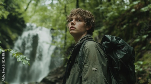 © Khmel, Fototapeta premium Young hiker gazes toward a distant waterfall in lush forest
