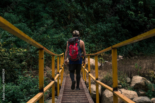 © Saintdags, Fototapeta premium young hiker man crossing a bridge and carrying a red backpack surrounded by green bushes and trees in the rainforest on Ena hill in Costa Rica