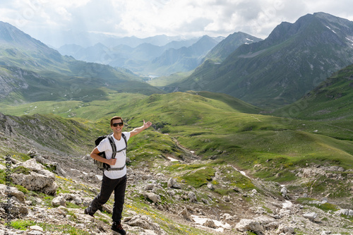 Naklejka premium Young hiker walking with the wonderful panorama of the swiss alps in the background