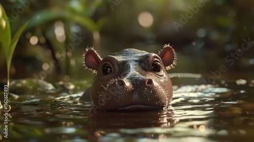 Fototapeta premium Young Hippopotamus Submerged In Tranquil Water