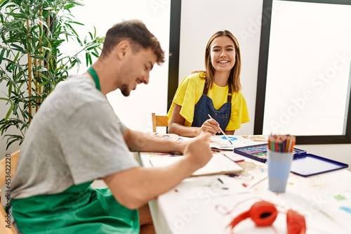 Obraz premium Young hispanic artist couple smiling happy drawing at art studio.