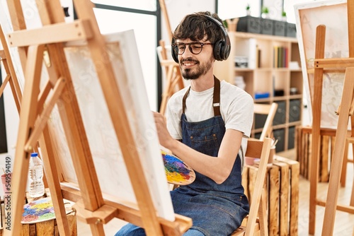 Obraz premium Young hispanic artist man listening to music drawing at art studio.