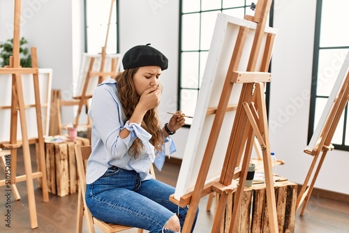 Obraz premium Young hispanic artist woman painting on canvas at art studio feeling unwell and coughing as symptom for cold or bronchitis. health care concept.
