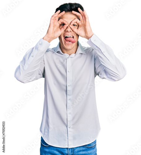 © Krakenimages.com, Naklejka premium Young hispanic business man wearing business clothes doing ok gesture like binoculars sticking tongue out, eyes looking through fingers. crazy expression.