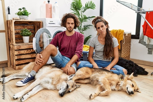 Obraz premium Young hispanic couple doing laundry with dogs skeptic and nervous, frowning...