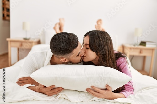 Fototapeta premium Young hispanic couple lying in bed kissing at home.