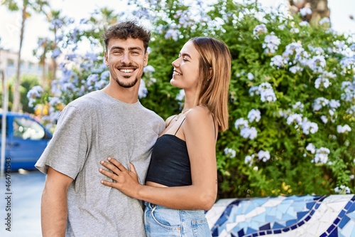 © Krakenimages.com, Fototapeta premium Young hispanic couple smiling happy and hugging standing at the city.