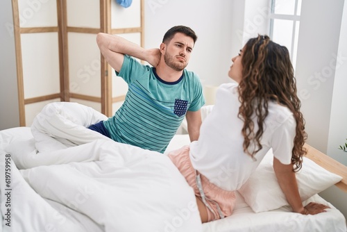 Fototapeta premium Young hispanic couple waking up with tired expression at bedroom