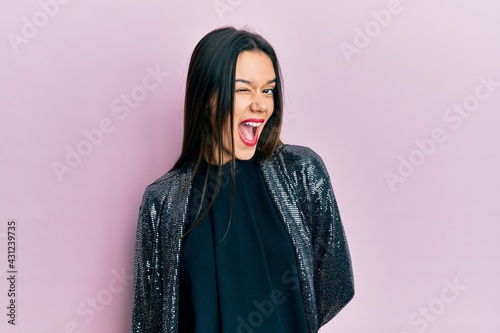 Fototapeta premium Young hispanic girl wearing party jacket winking looking at the camera with...