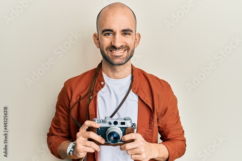 Fototapeta premium Young hispanic man holding vintage camera smiling with a happy and cool smile on face. showing teeth.